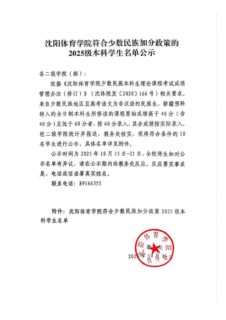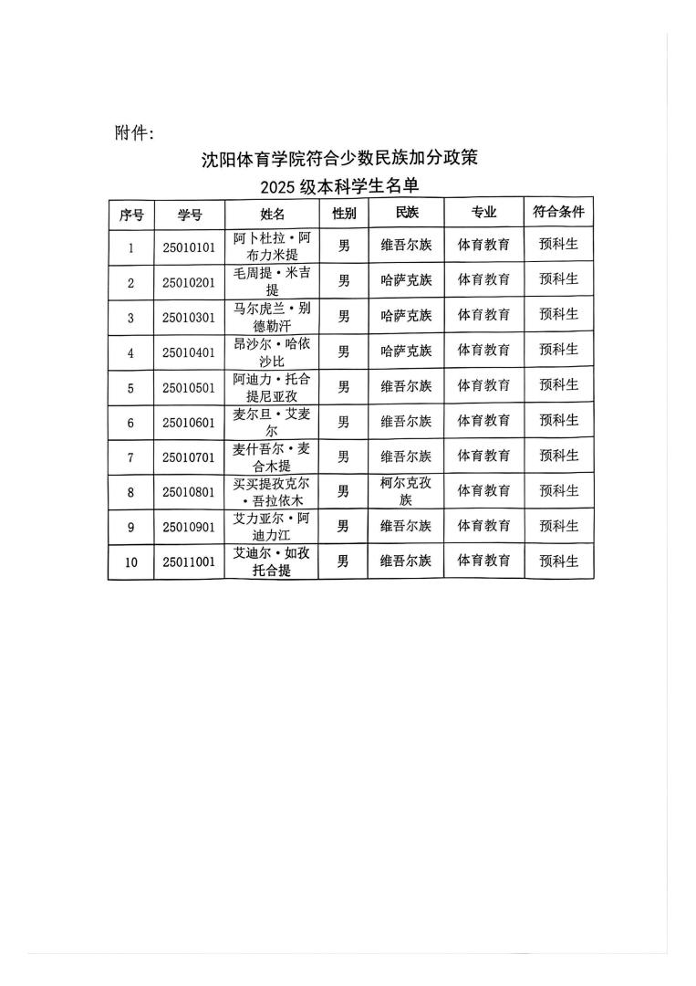沈阳体育学院符合少数民族加分政策的2025级本科学生名单公示
