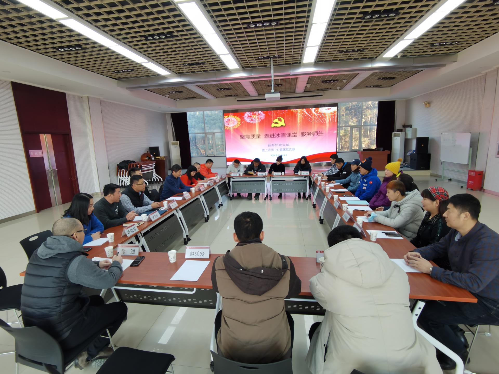 会上,雪上运动中主任王晓辉介绍了雪场在保障服务教学方面的工作,在造雪和雪道建设、教师吃住、雪具准备等方面,严格按照开课时间进行了认真、周密部署,确保雪课如期进行。冰雪教研室教师代表介绍了雪课授课基本情况,提出了雪课教学过程中所面临的困难和问题。两个支部党员认真倾听教师和学生代表发言,耐心细致地答疑解惑。